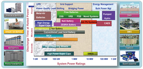 대부분의 에너지를 수입에 의존하고 있는 우리나라의 특성상 에너지 이용효율 향상을 비롯한 신재생에너지는 매우 중요한 기술이다. 신재생에너지는 최근에 그림 1과 같이 그 비중이 점차 확대되면서 전력 생산의 변동성과 수급 시점의 불일치 문제를 극복할 수 있는 새로운 대안으로 전력저장 장치가 주목을 받고 있다. 2050년까지 이러한 신재생에너지 비중이 46%까지 증가할 경우, 전 세계적으로 전력 생산의 변동성이 적지 않은 규모에 이를 것으로 예상되기 때문에 최근 IEA는 미래 신재생에너지 보급을 위해 전력 저장장치에 주목하고 있으며, 장기적인 관점에서 전력저장 장치의 보급은 신재생에너지 확대를 위한 필수 불가결한 요소가 될 수밖에 없는 상황이다. 우리나라에서도 신재생에너지에 대한 지원정책을 2012년부터 RPS(Renewable Portfolio Standard; 신재생에너지 의무할당제 또는 의무공급제)로 전환하여 시행할 계획이다. RPS에 대한 내용으로는 공급의무자의 연도별 의무비율을 2012년 2.0%로 시작해서 2016년까지 매년 0.5%씩 올리고, 2016년부터 매년 1.0%씩 늘려 2022년에 10.0%로 확대한다는 것이 주요 골자이다. 신재생에너지원으로는 풍력 발전이나 태양광 발전이 있으며 이들은 환경에 따라 출력의 변동이 있어 바로 계통에 연계시킬 경우 주파수 변동을 발생시켜 고장의 원인이 될 수 있기 때문에 이의 해결방안으로 전력저장용 대용량 전지를 적용하는 것이다. 전력 저장장치는 발전량이 많을 때는 전기를 충전하고, 소비량이 많을 때는 전기를 방전함으로써 수요와 공급의 격차를 효율적으로 줄일 수 있으며 짧은 시간 내 신재생에너지 발전량 변동에 대응할 수 있는 가장 안전한 방법으로 평가되고 있다. 대규모 태양광 발전 및 풍력 발전 단지에는 대용량 이차전지저장시스템이 각광을 받고 있으며, 잉여전력이나 야간 저부하시에는 양수발전, 압축공기 에너지저장, 초전도 에너지저장, 플라이휠 저장장치 등이 적용될 수 있다. 다양한 전기에너지저장시스템의 특성 중 출력과 사용 시간에 따라 분류하면 그림 2와 같다. 이중에서도 이차전지와 양수발전이 가장 유력한